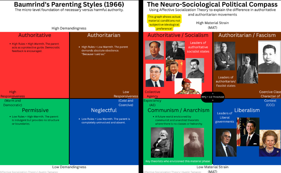 Viewed through the lens of Affective Socialization Theory, forced sameness would actually be a rigid form of coercive demandingness. The actual goal of socialist economics is to structurally lower Objective Material Strain (MAT-O) below the critical biological threshold for every single citizen. By universally guaranteeing basic survival needs like housing, healthcare, and food, society stops the amygdala from forcing the population into chronic survival-mode panic.